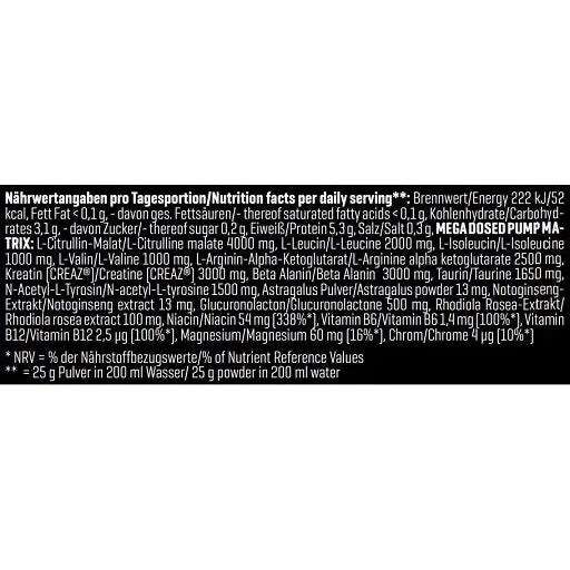 L-Citrullin-Malat 16%, wasserfreies Kreatin 12.2%, Beta Alanin 12%, L-Arginin Alpha Ketoglutarat 10%, Maltodextrin, L-Leucin 8%, Taurin, L-Tyrosin 6%, L-Isoleucin 4%, L-Valin 4%, Aroma enthält Laktose, Magnesiumcitrat, D-Glucoronolacton, Natriumhydrogencarbonat, Trennmittel Siliciumdioxid, Süßungsmittel Acesulfam K, Natriumcyclamat, Saccharin, Sucralose, Rhodiola Rosea-Extrakt, Niacin, Emulgator Lecithine Soja, Pyridoxinhydrochlorid, Farbstoffe Carotin, Chrom-III-chlorid, Cyanocobalamin. CREAZ®