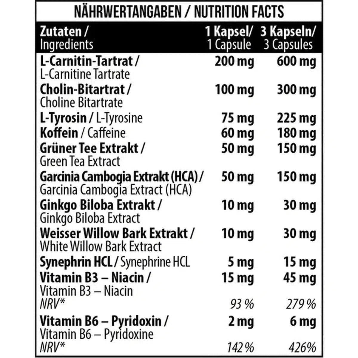 L-Carnitin-Tartrat, Kapselhülle: Cellulose, Cholin-Bitartrat, L-Tyrosin, Koffein, Grüner Tee Extrakt, Garcinia Cambogia Extrakt (HCA), Vitamin B3, Gingko Biloba, Weisser Willow Bark Extrakt, Citrus Aurantium Extrakt (enthält natürliches Synephrin), Vitamin B6.
